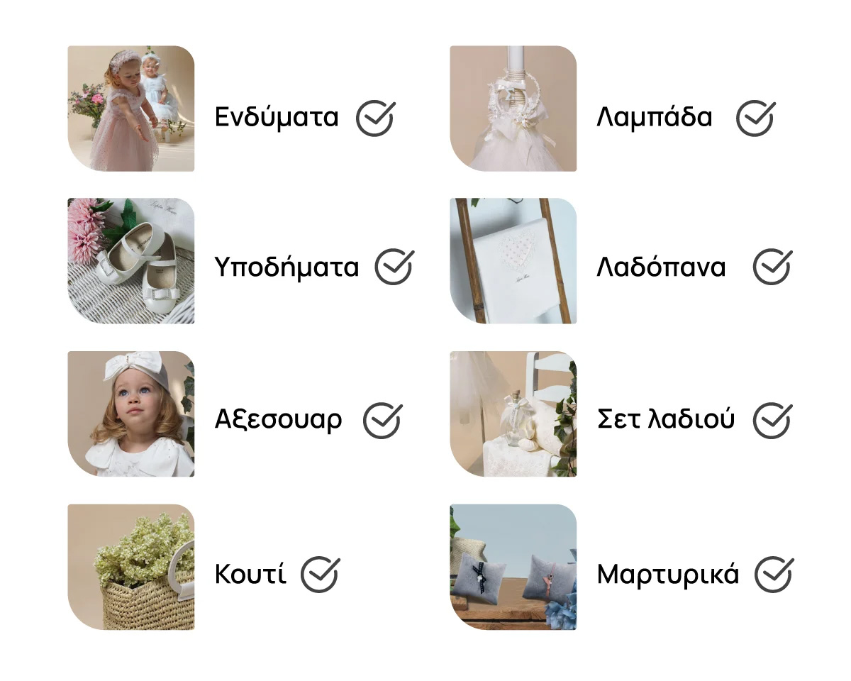 1.  Ένδυμα Βάπτισης για την εμφάνιση πριν τη Βάπτιση και μετά το μυστήριο της Βάπτισης